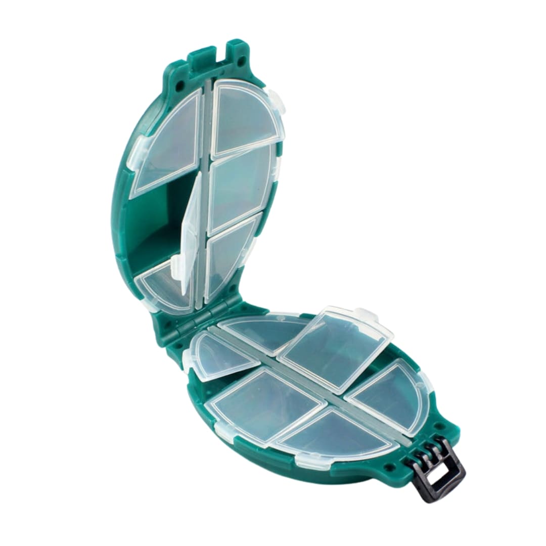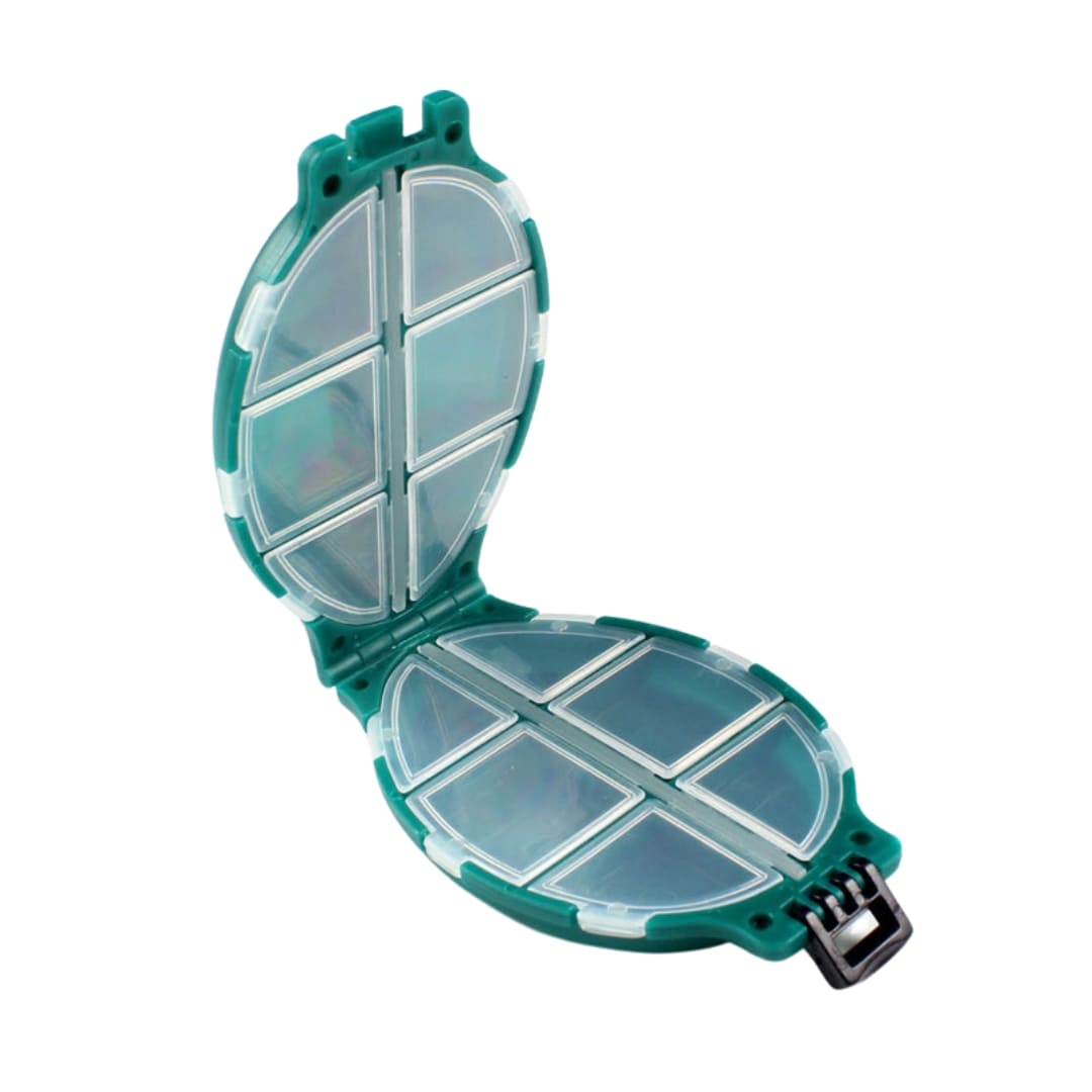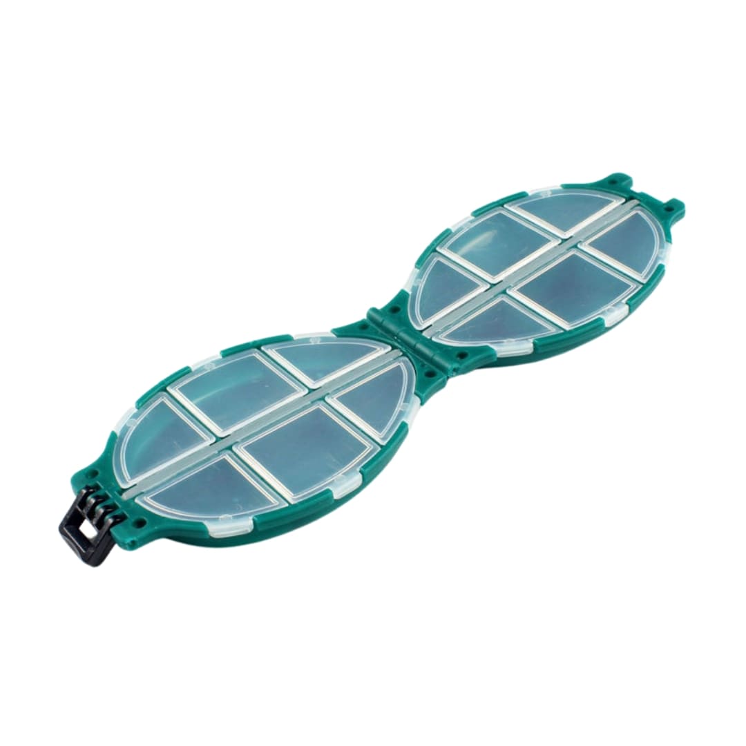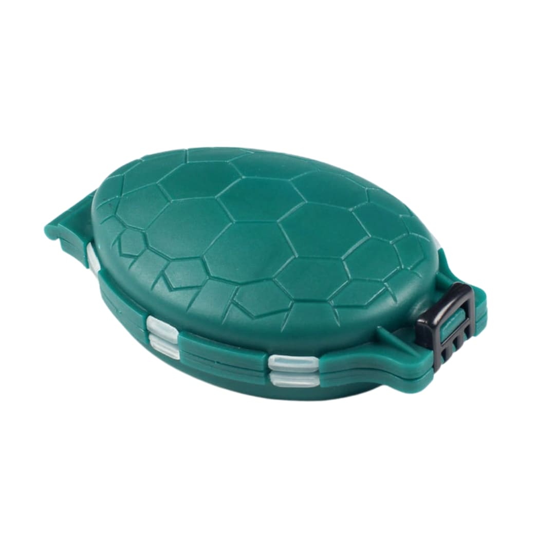Gavetero porta accesorios tipo tortuga, diseñado para mantener organizados tus anzuelos, señuelos y pequeños accesorios de pesca. Compacto y práctico, permite acceder fácilmente a cada compartimiento sin perder tiempo.
