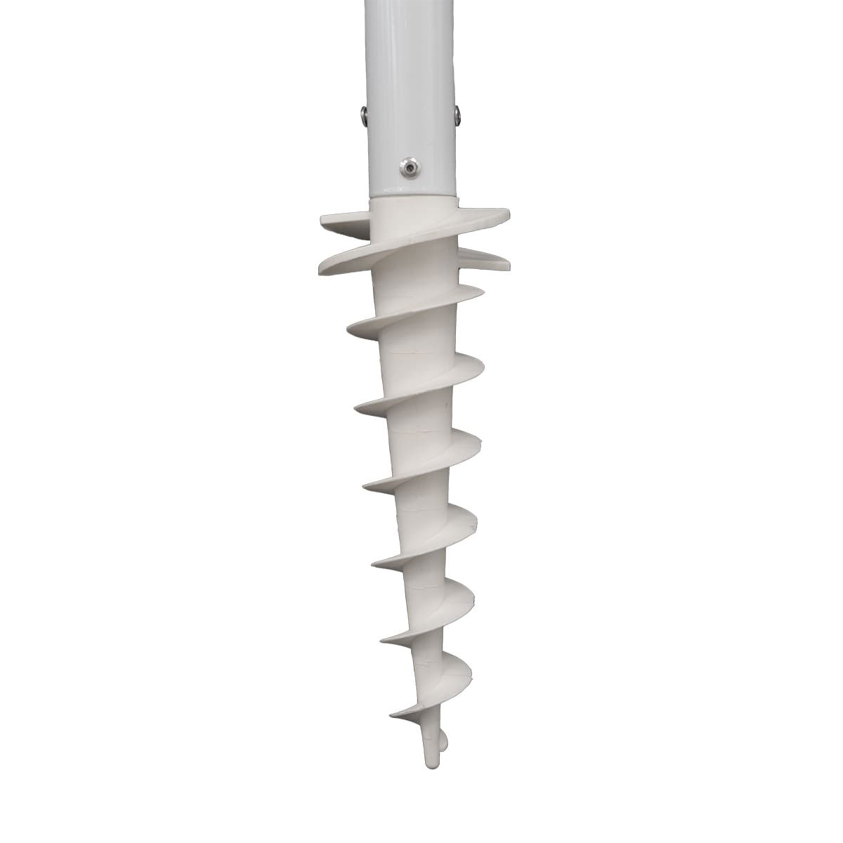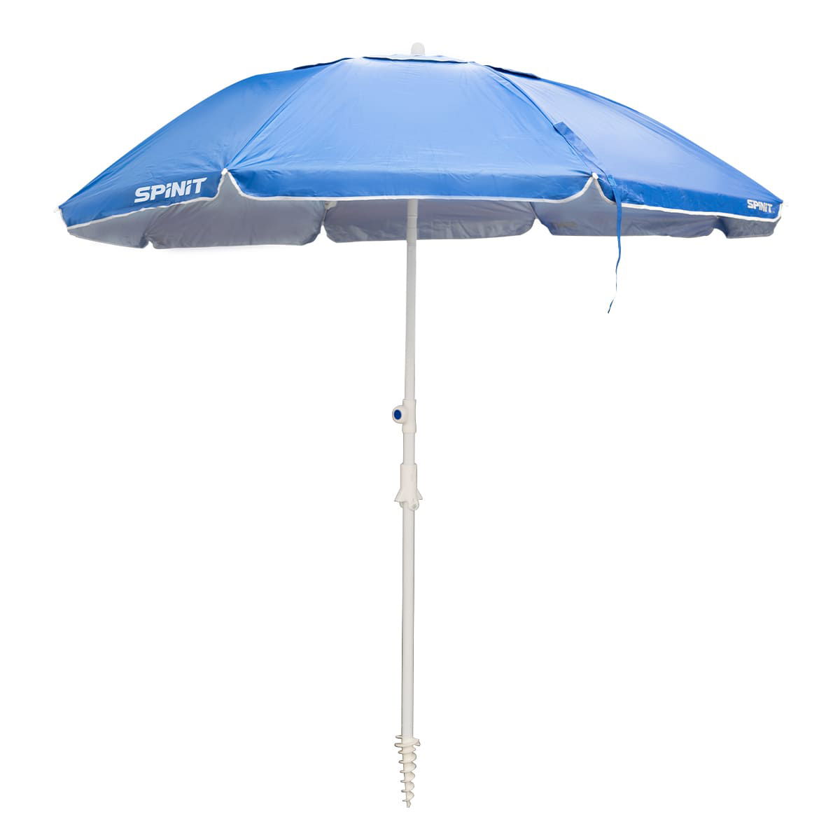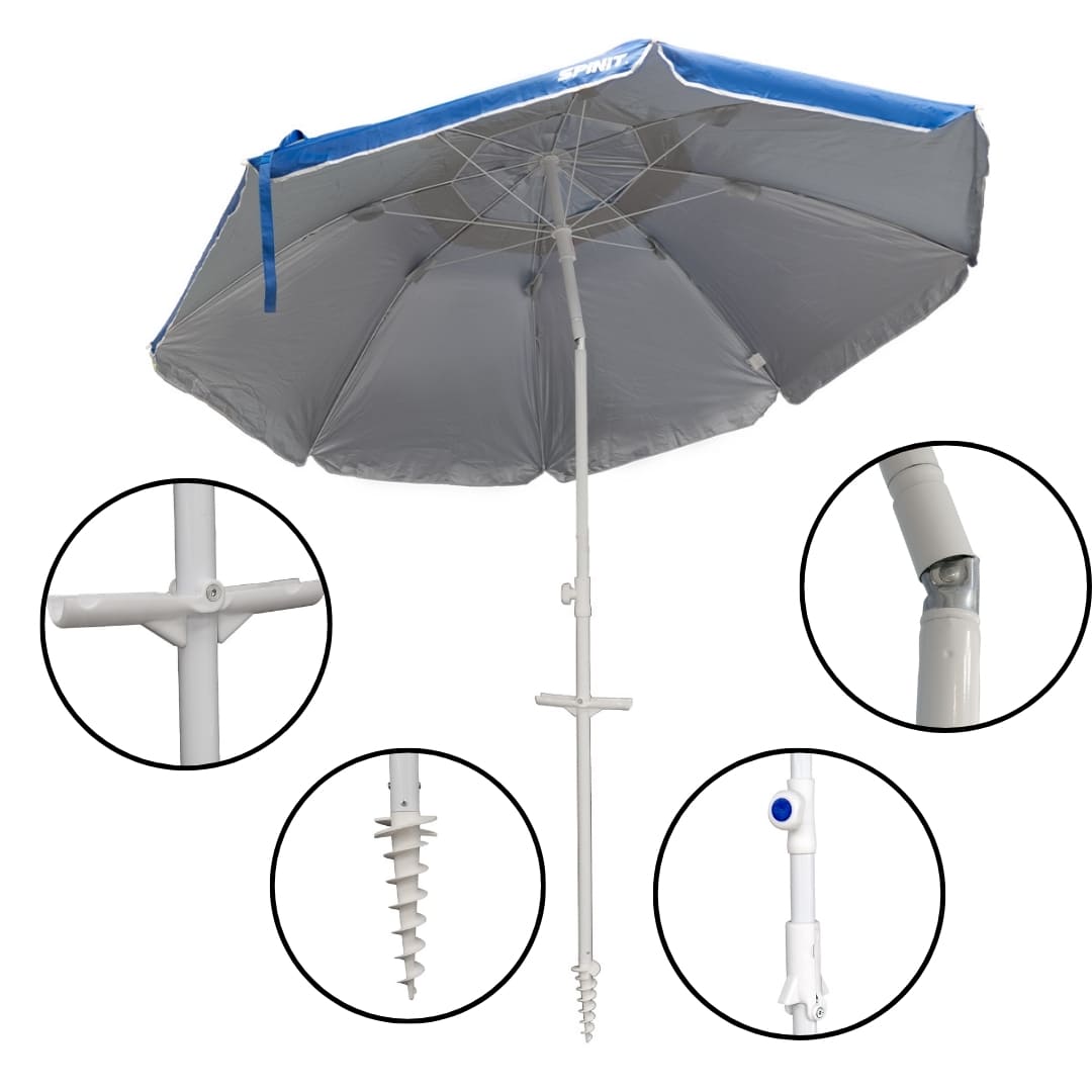 Sombrilla playera con salida de aire para disminuir resistencia al viento y tornillo para poder instalarla en al arena. Incluye bolso de transporte.